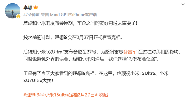 怎么个事呢?原来按照理想的计划,理想首款纯电SUV i8将会在2月27日正式官宣亮相,而不巧的是,小米已经官宣小米“双Ultra”(即小米15 Ultra与小米SU7 Ultra)发布会也定在了2月27日。